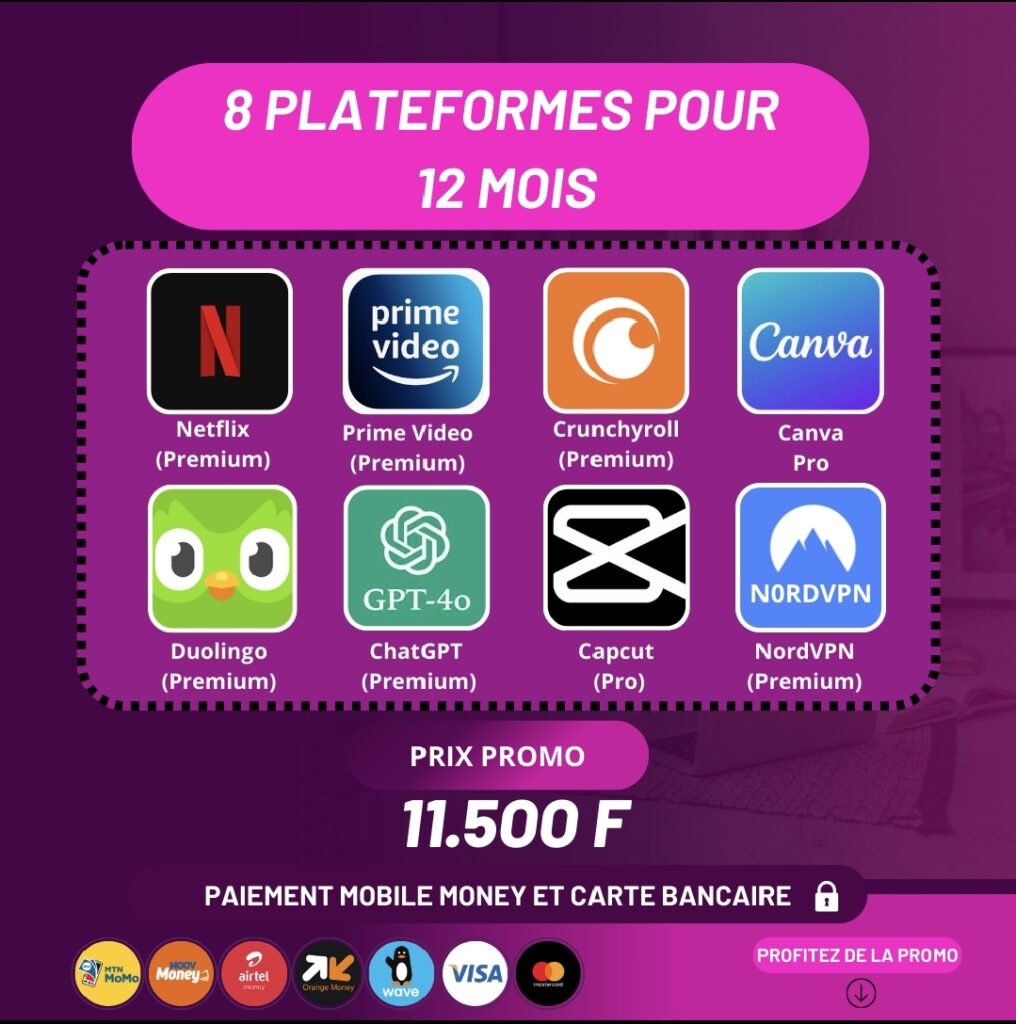 Offrez-vous un accès premium illimité à une variété d’applications populaires grâce à notre abonnement exclusif. Profitez de services de streaming de première classe sur Netflix, Prime Video et Crunchyroll. Libérez votre créativité avec Canva Pro et CapCut Pro. Améliorez vos compétences linguistiques avec Duolingo. Interagissez de manière intelligente avec ChatGPT 4. Garantissez votre sécurité en ligne avec Nord VPN. Obtenez une valeur exceptionnelle et une expérience numérique enrichissante, le tout regroupé dans un seul abonnement pratique. Accédez dès maintenant à ces 8 applications premium pour un divertissement, une productivité et une protection exceptionnels.