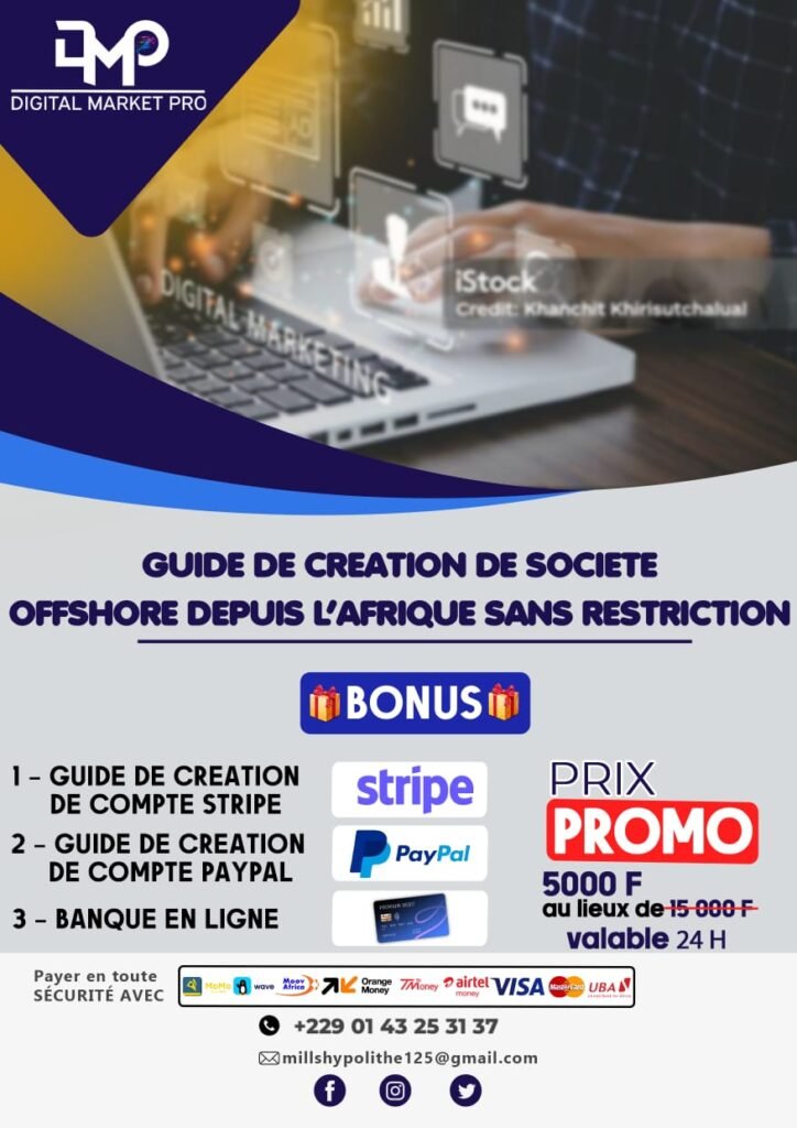 Découvrez notre formation complète pour la création de sociétés offshore depuis l’Afrique. Apprenez à créer une entreprise internationale, à ouvrir des comptes PayPal, Stripe et des banques en ligne, tout en profitant des avantages fiscaux et juridiques.