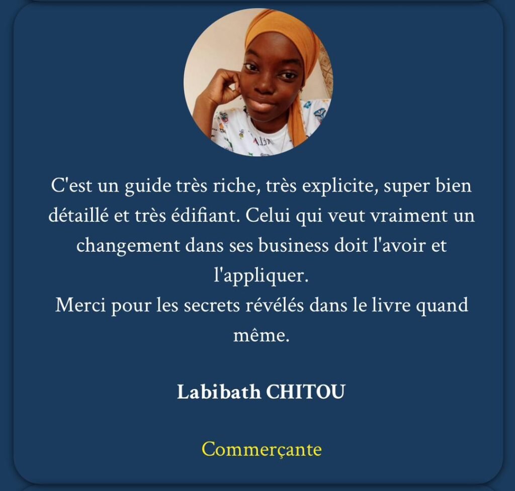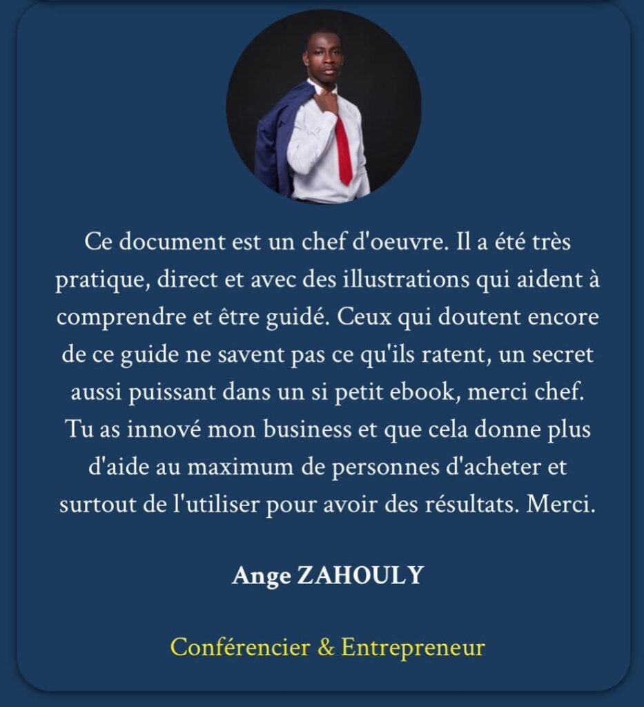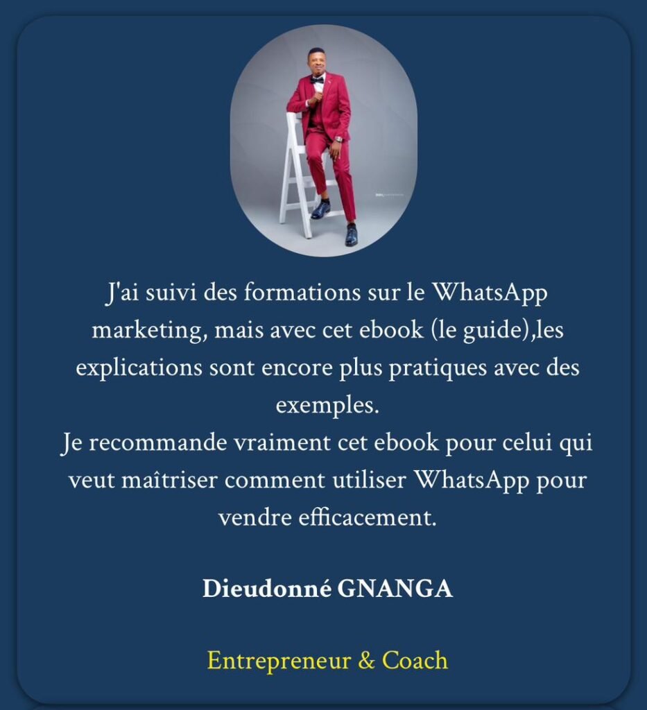 Il s’agit d’un guide dans lequel vous découvrirez étape par étape comment passer de 0 à plus d’1 MILLION de francs CFA de chiffres d’affaires en faisant de la vente sur WhatsApp, que ce soit de produits physiques ou digitaux, de services ou encore pour monétiser vos compétences. Ce sont des stratégies de vente hors pair qui y sont consignées de manière que tout le monde puisse les comprendre et les appliquer. Que vous ayez actuellement des produits ou pas, ce guide vous aidera à identifier et rechercher les meilleurs produits pour vous lancer même en tant que débutant
