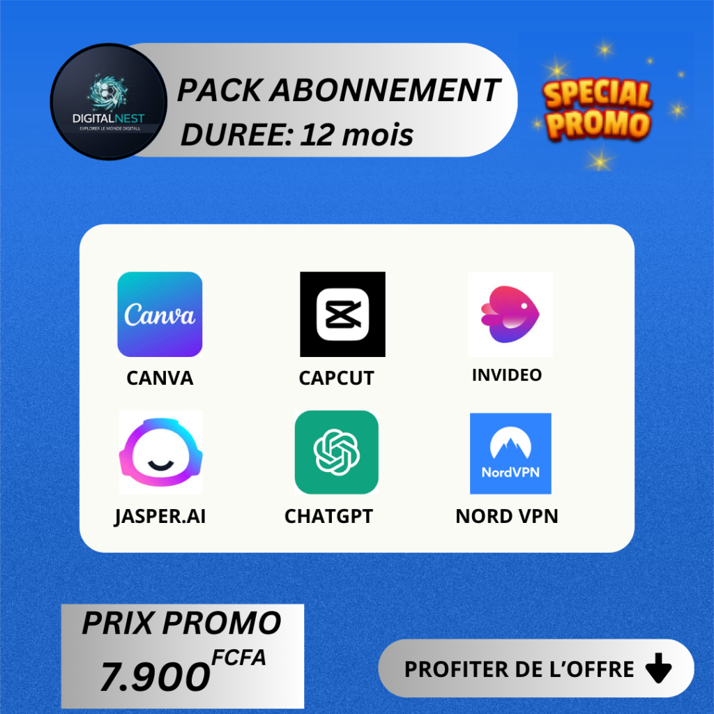 - Avec ce Pack Abonnement Premium, vous aurez accès pendant 12 mois à des outils incontournables pour créer, éditer, optimiser et protéger vos contenus et données. Ce pack rassemble les meilleures plateformes du marché pour vous offrir une solution tout-en-un, indispensable à toute personne souhaitant maximiser sa productivité et protéger ses activités en ligne.